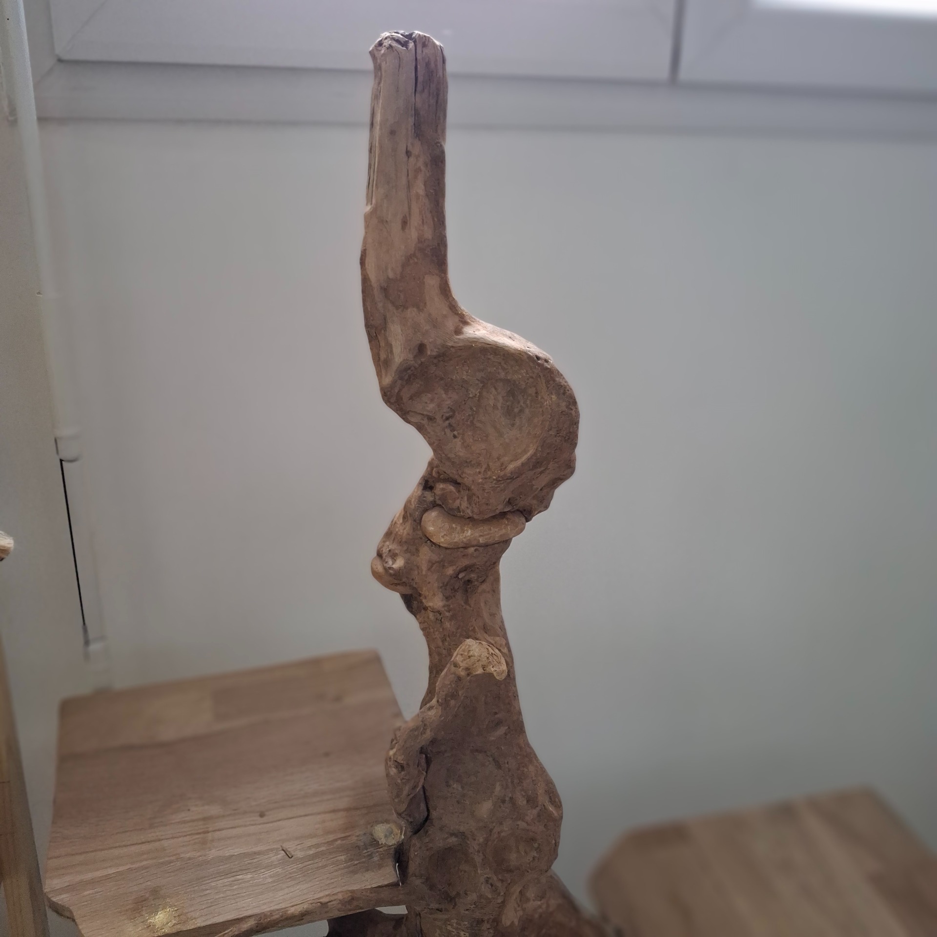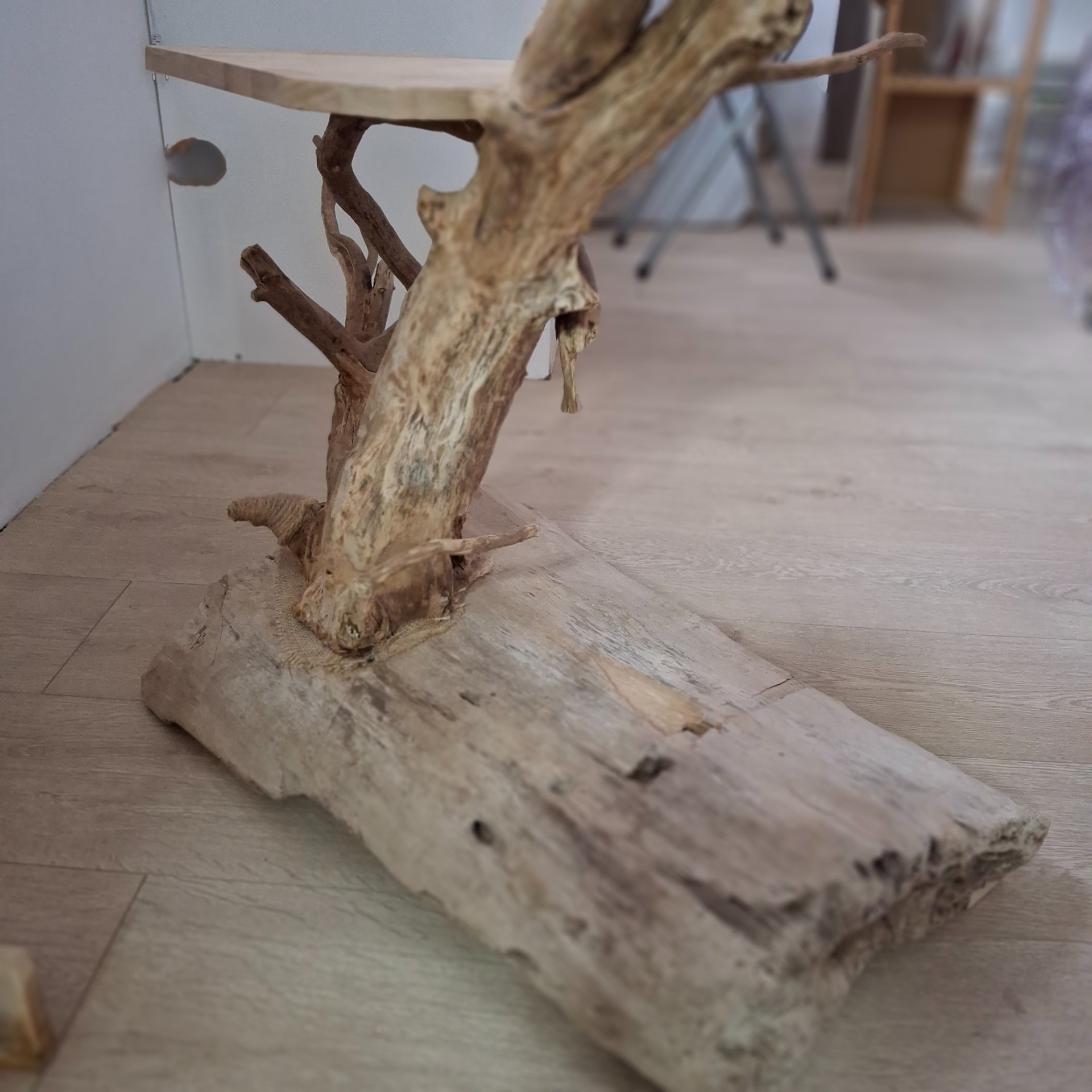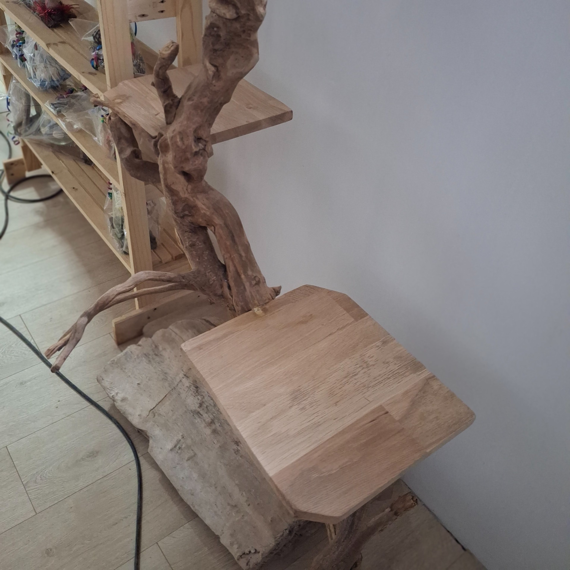 Arbuste totalement nu de ses écorces et poncé minutieusement, laissant apparaître des pierres incrustées au fil du temps. Votre chat sera ravi par la taille de ce produit. Également il embellira votre séjour en y posant des plantes sur les planches de chêne.