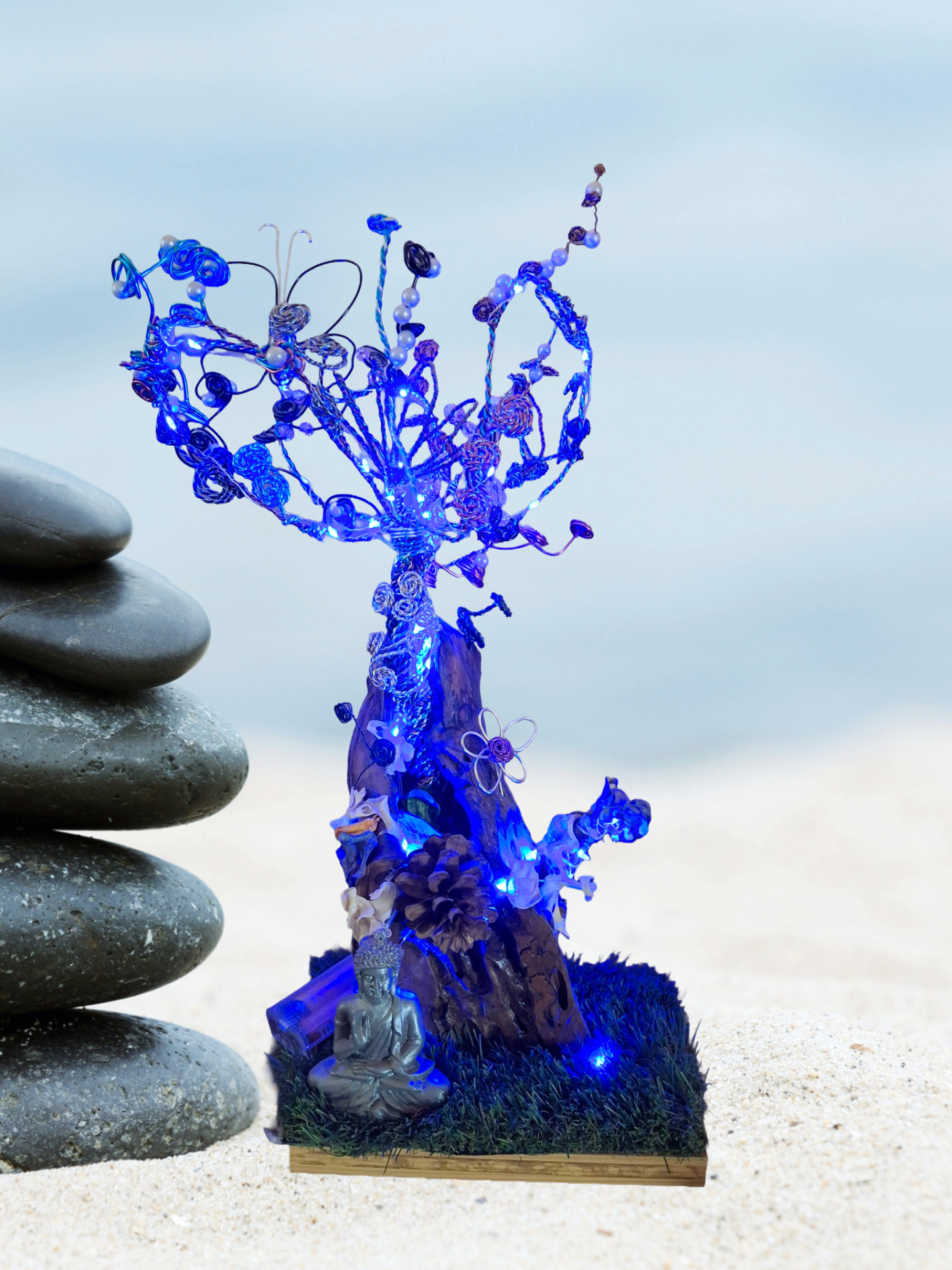 Ajoutez une touche artisanale unique à votre maison avec ce luminaire LED bleu fabriqué à la main. Il présente un magnifique design d'arbuste en fil d'aluminium, complété par une base en bois traité pour une touche rustique.