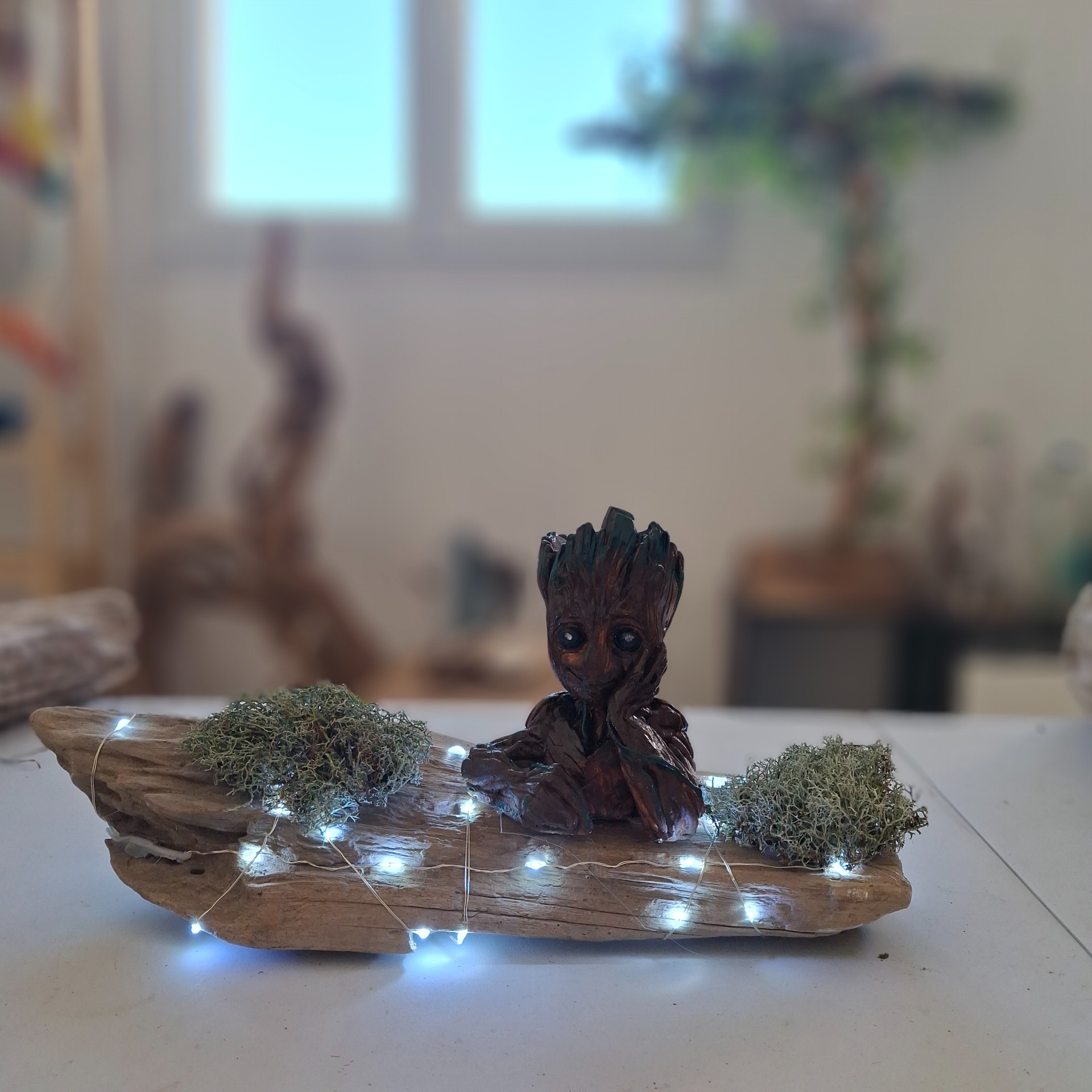 Groot en plâtre réfléchi sur son bateau en bois flotté. Ce luminaire original rendra votre pièce agréable avec cette lumière led à piles de couleur blanche.Sa mousse est naturelle, représentant l'union de la mer et de la forêt, la nature.
