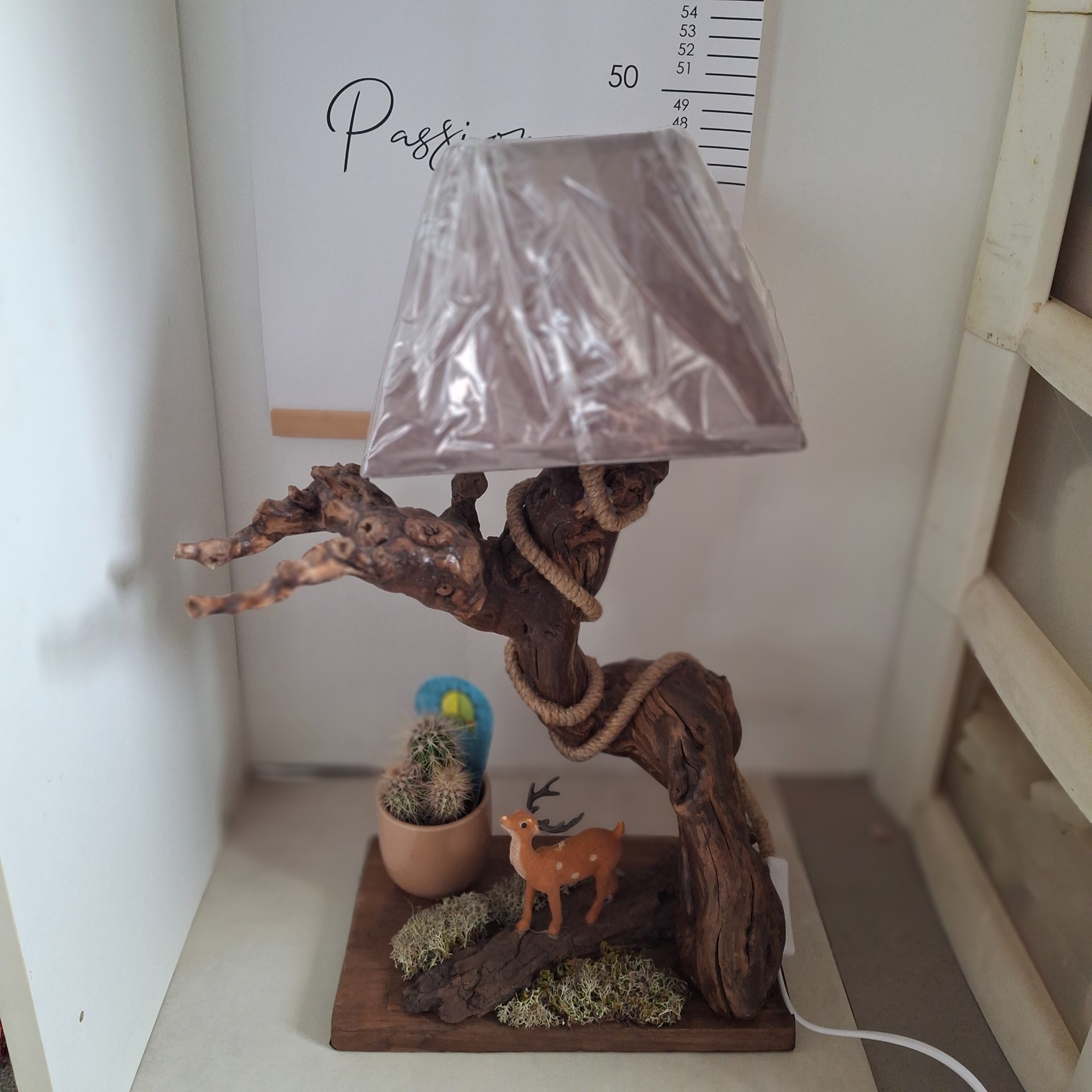 La magie de cette lampe unique est son décor, bois de vigne travaillé et traité, sa mousse naturelle séchée ainsi que son cactus représentant la nature, l'évasion dans la campagne.