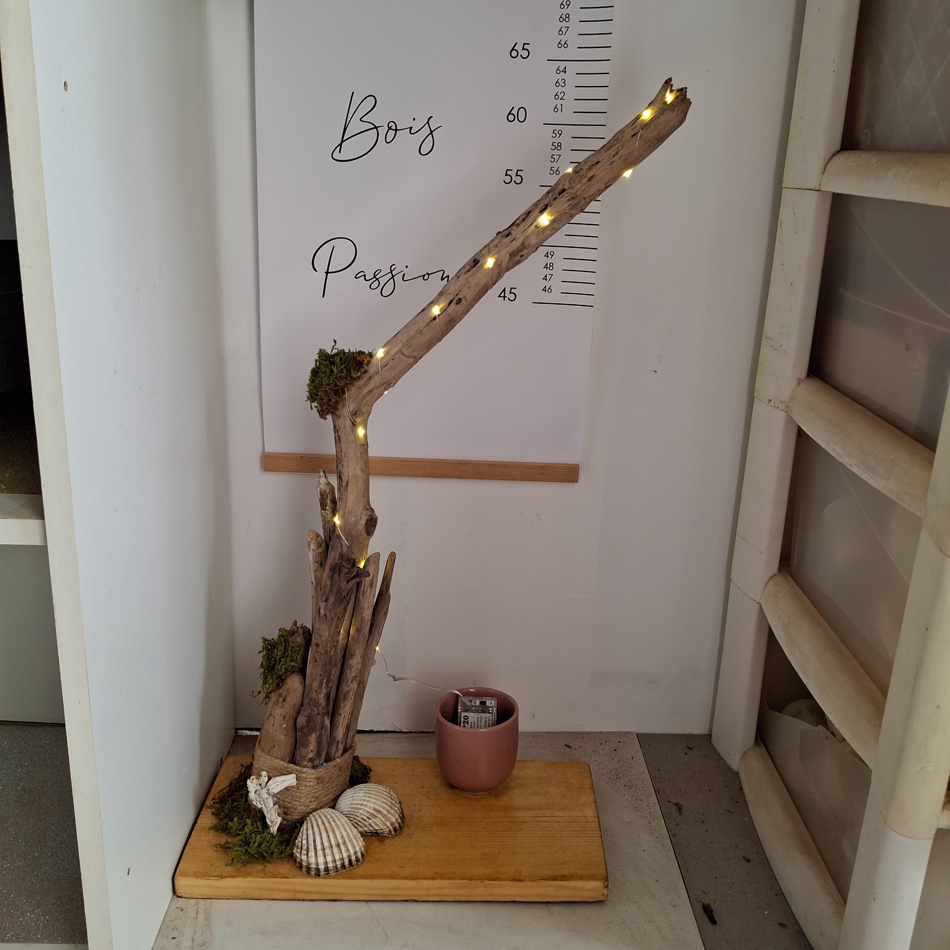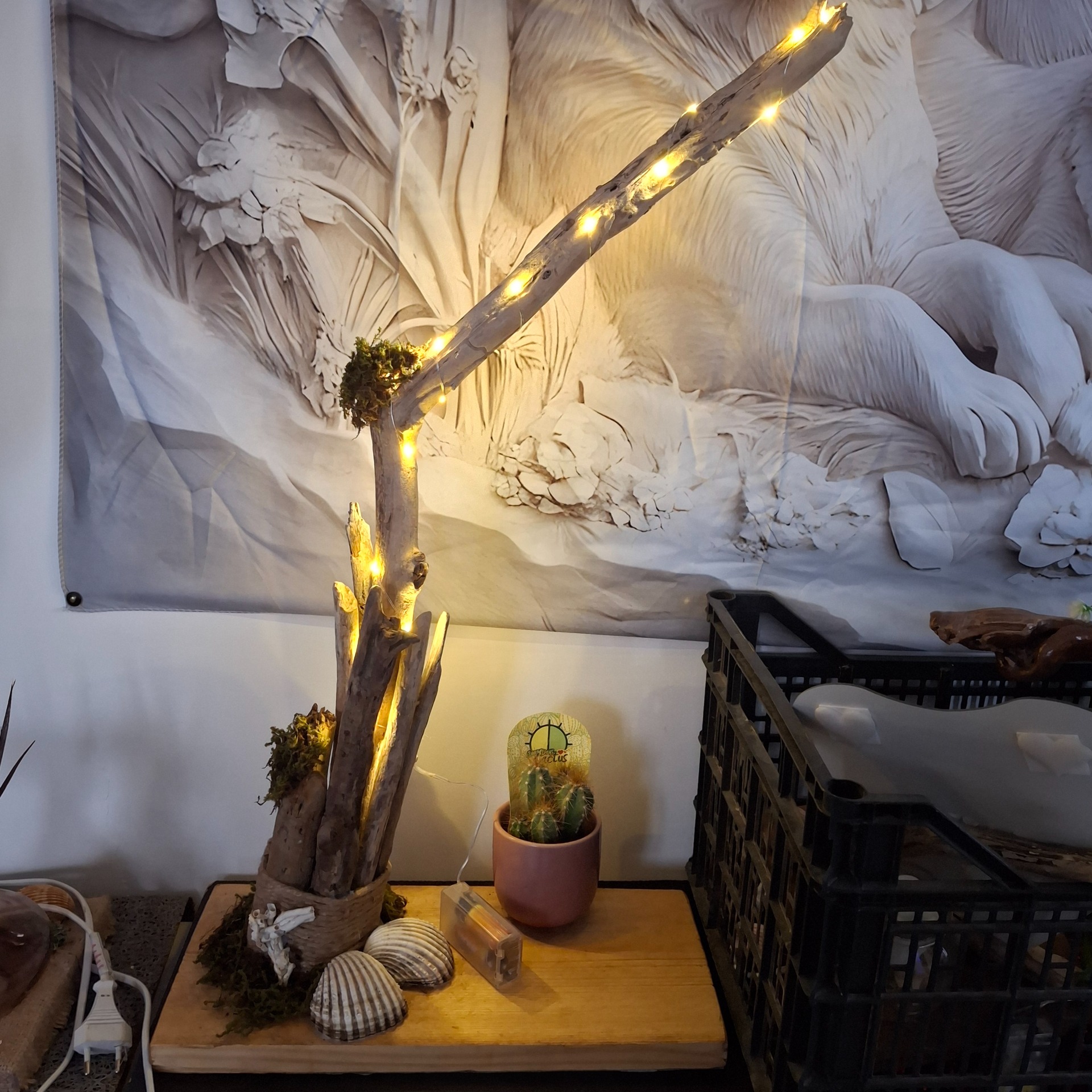 Luminaire en bois flotté avec mousse naturelle séchée.Un petit pot en terre cuite cache ce beau cactus pour mélanger la nature.Dimensions :