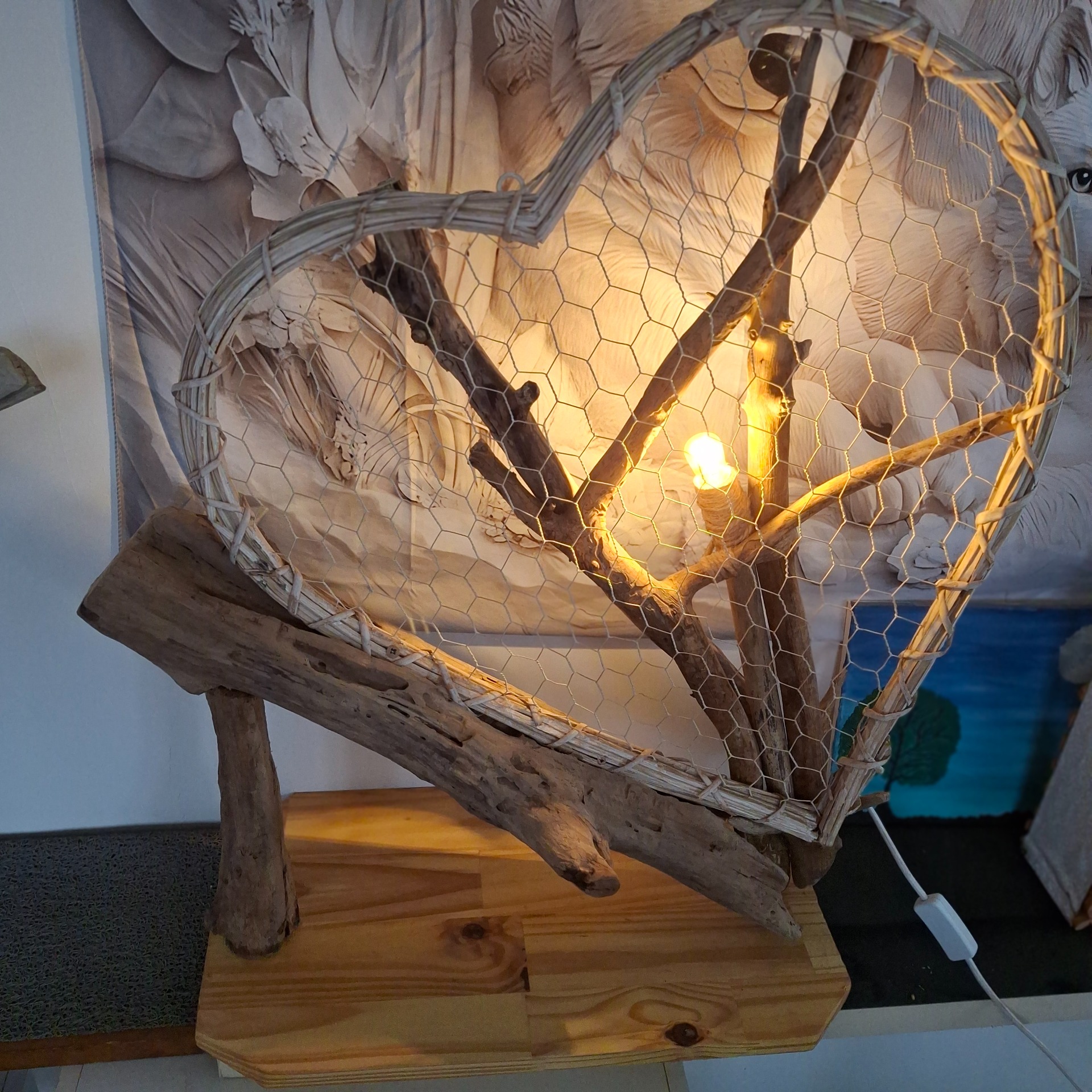 Le socle est teinté avec de l'huile de lin, il porte de nombreux morceaux de bois flotté, unis les uns avec les autres. Un beau coeur en grillage de fer et bois vient ajouter une touche d'amour à cette lampe.