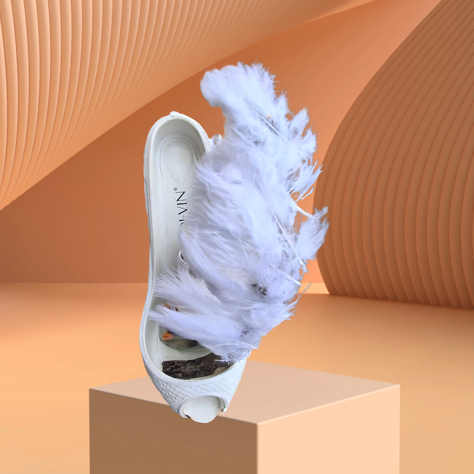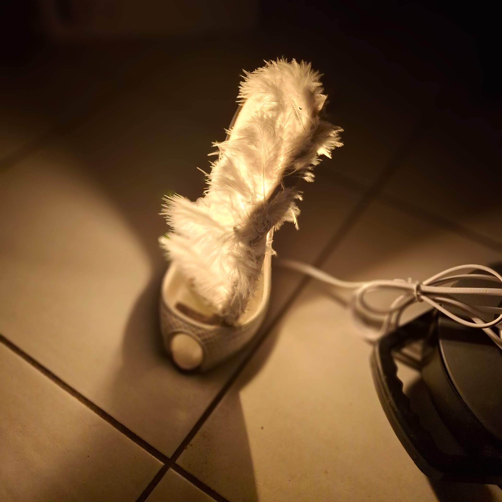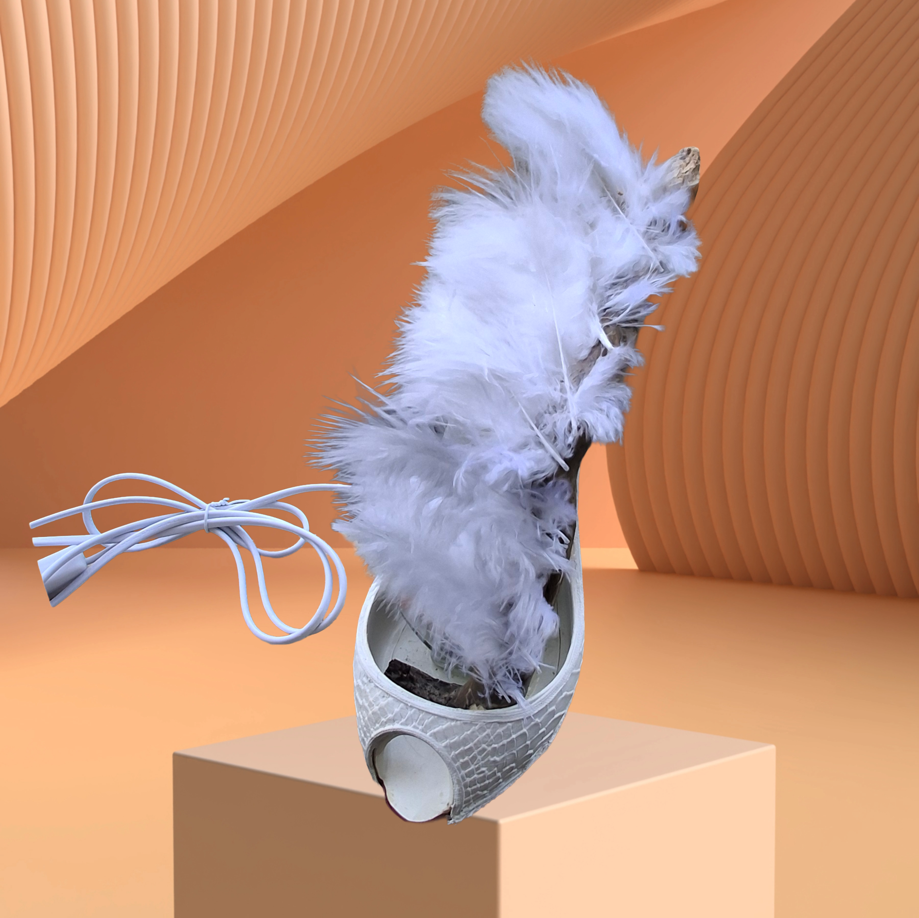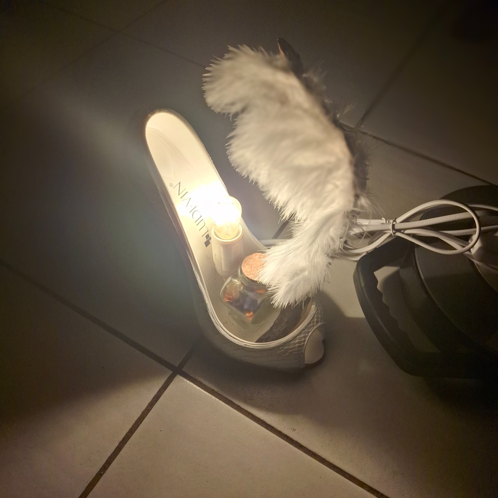 Elle est créée avec un porte bouteille en forme de chaussure à talon, un bois flotté avec ses plumes blanches pour adoucir la luminosité. Un petit pot en verre en forme de coeur comporte un pot-pourri pour laisser diffuser un agréable parfum.