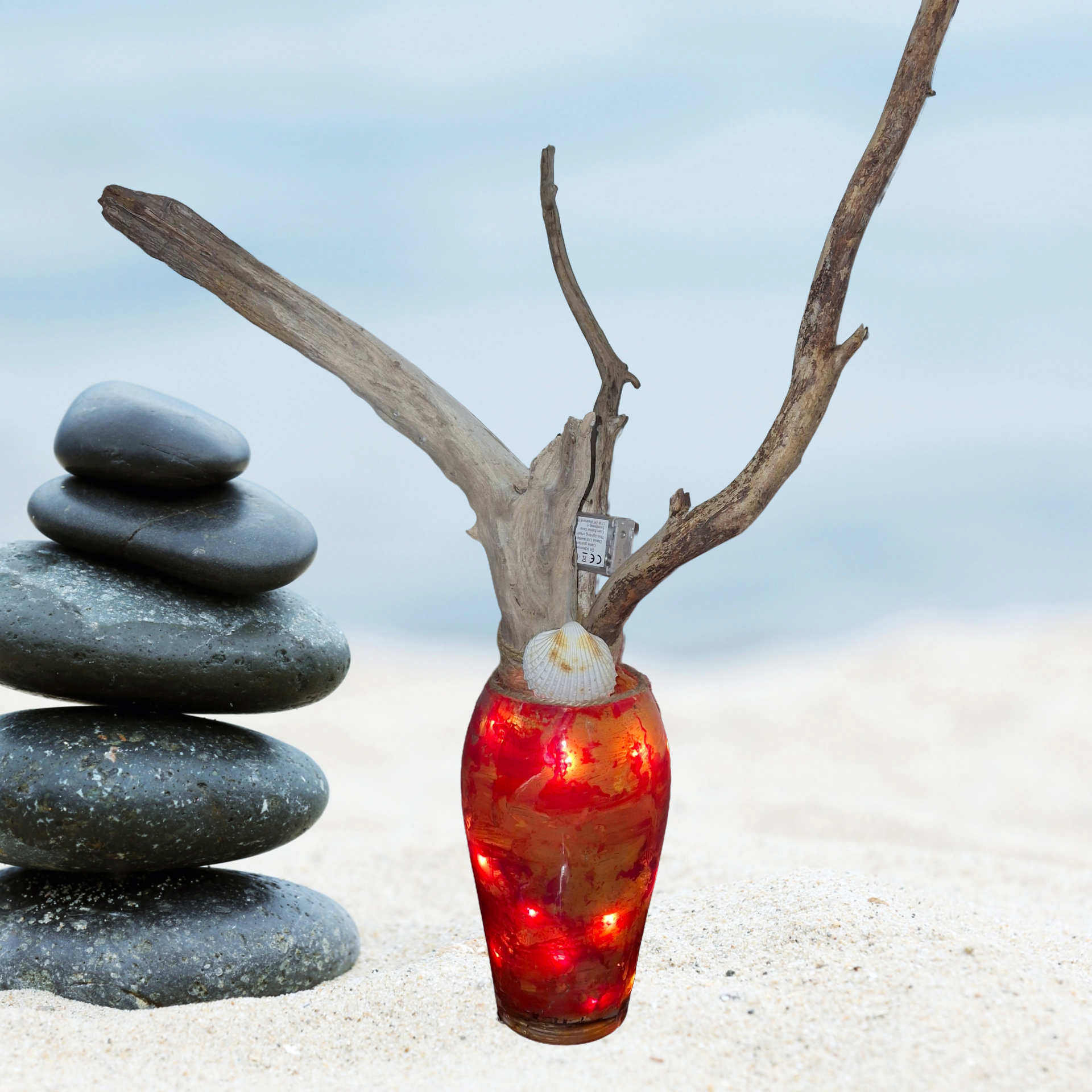 Ce luminaire est constitué d'un vase en verre recyclé, peint de couleurs vives et agrémenté de lumière à l'intérieur, ainsi que de bois flotté. Idéal pour obtenir de la douceur et de l'originalité entre la nature et la luminosité.