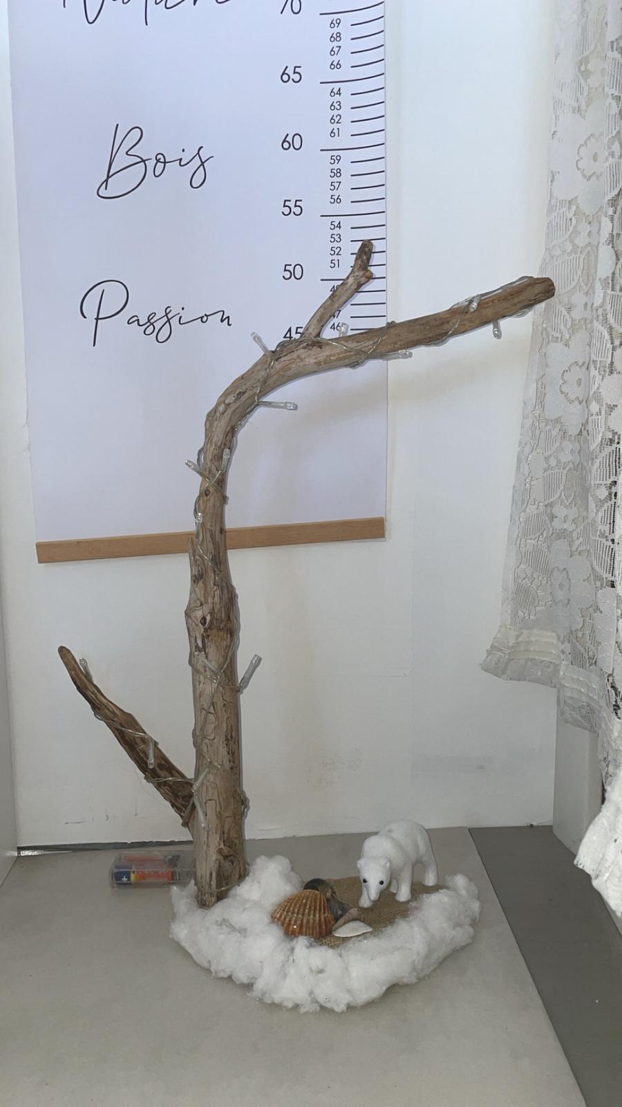 Le bois flotté, poli par le sel et le temps, raconte déjà son histoire : il a connu les tempêtes, les marées et la lumière changeante du ciel.