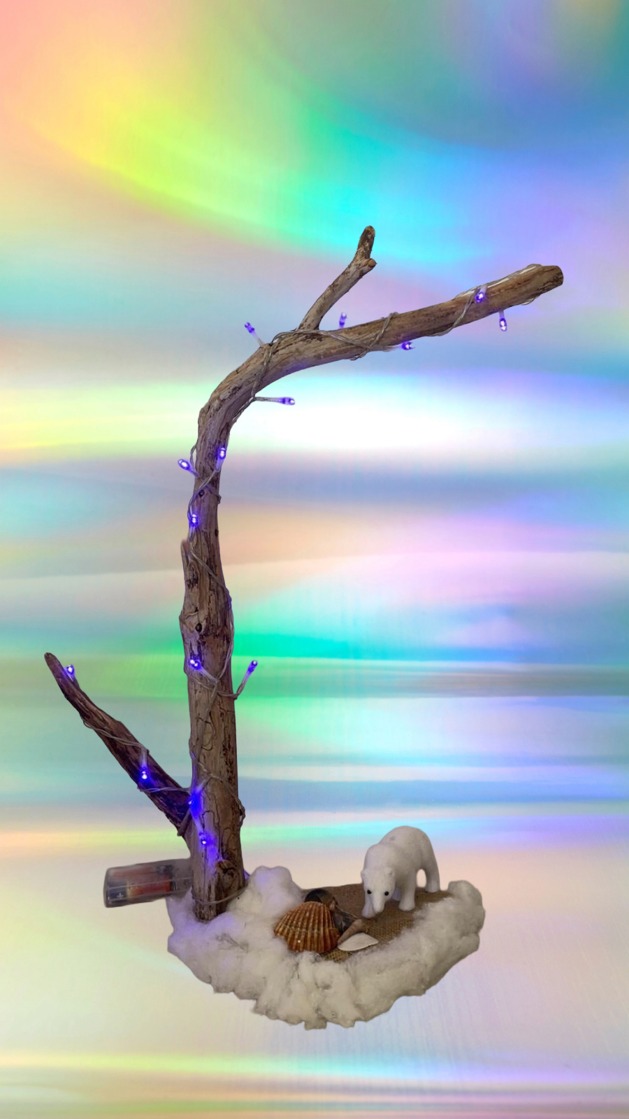 De la fausse neige vient se poser en légèreté, comme une caresse blanche. Quand la lumière s'allume, elle glisse sur le bois, éclaire la neige, réchauffe l'ours. Le contraste entre la lumière et la froideur du décor crée un équilibre parfait : un morceau d'hiver apprivoisé, un fragment de rêve suspendu.