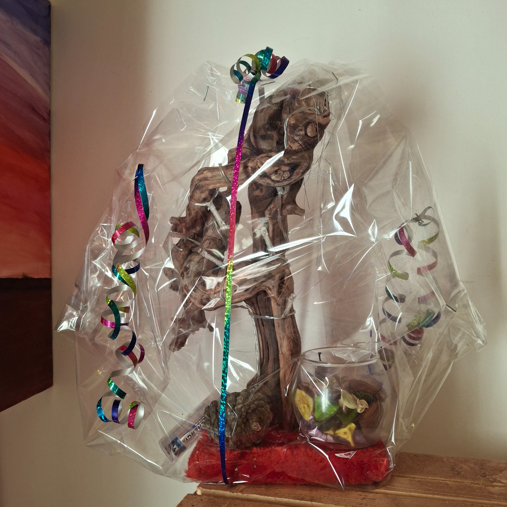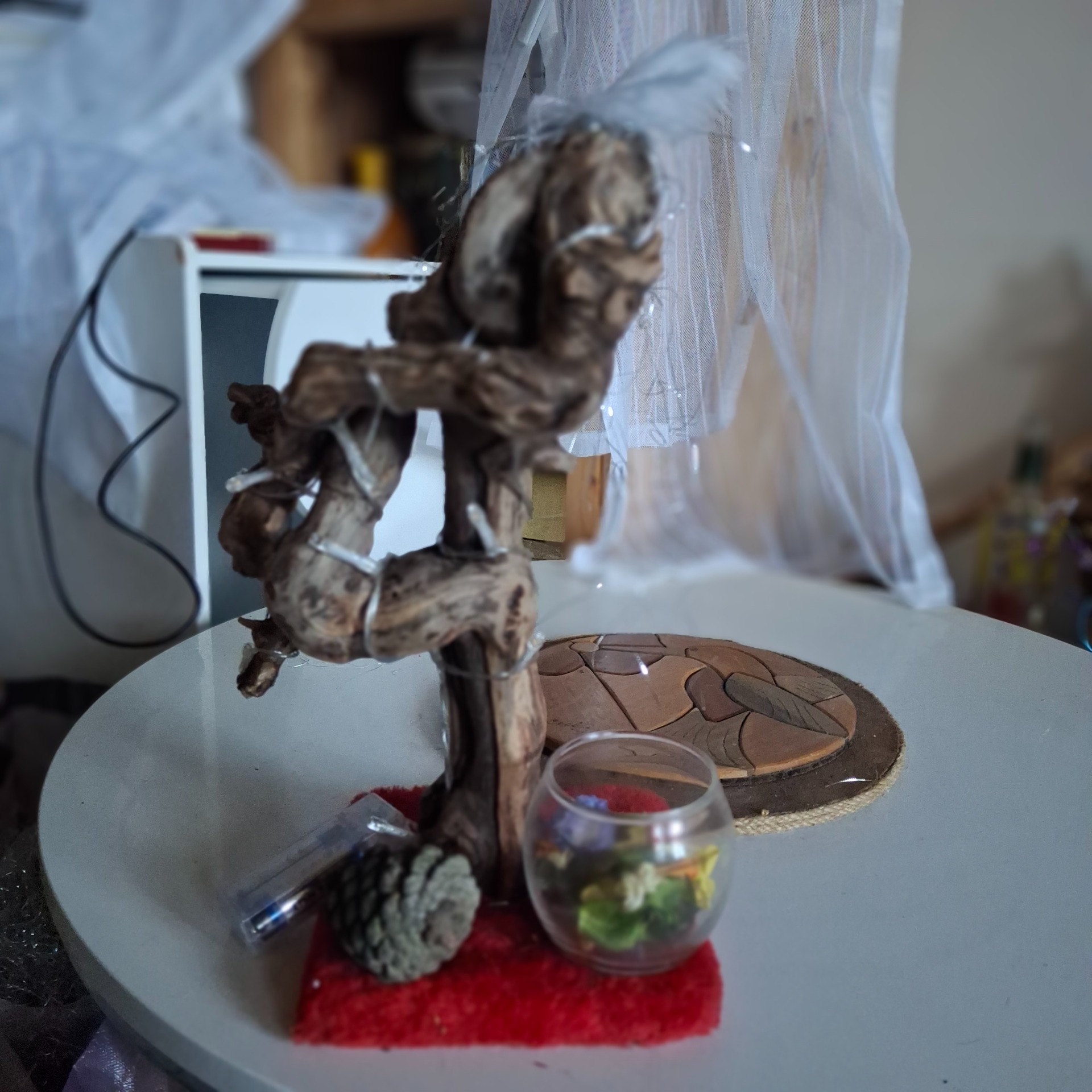 Très beau luminaire en bois de vigne travaillé méticuleusement et traité. Idéal pour agrémenter une pièce et tamiser son intérieur. Son socle est en bois recouvert de velours rouge faisant ressortir son pot-pourri parfumé.