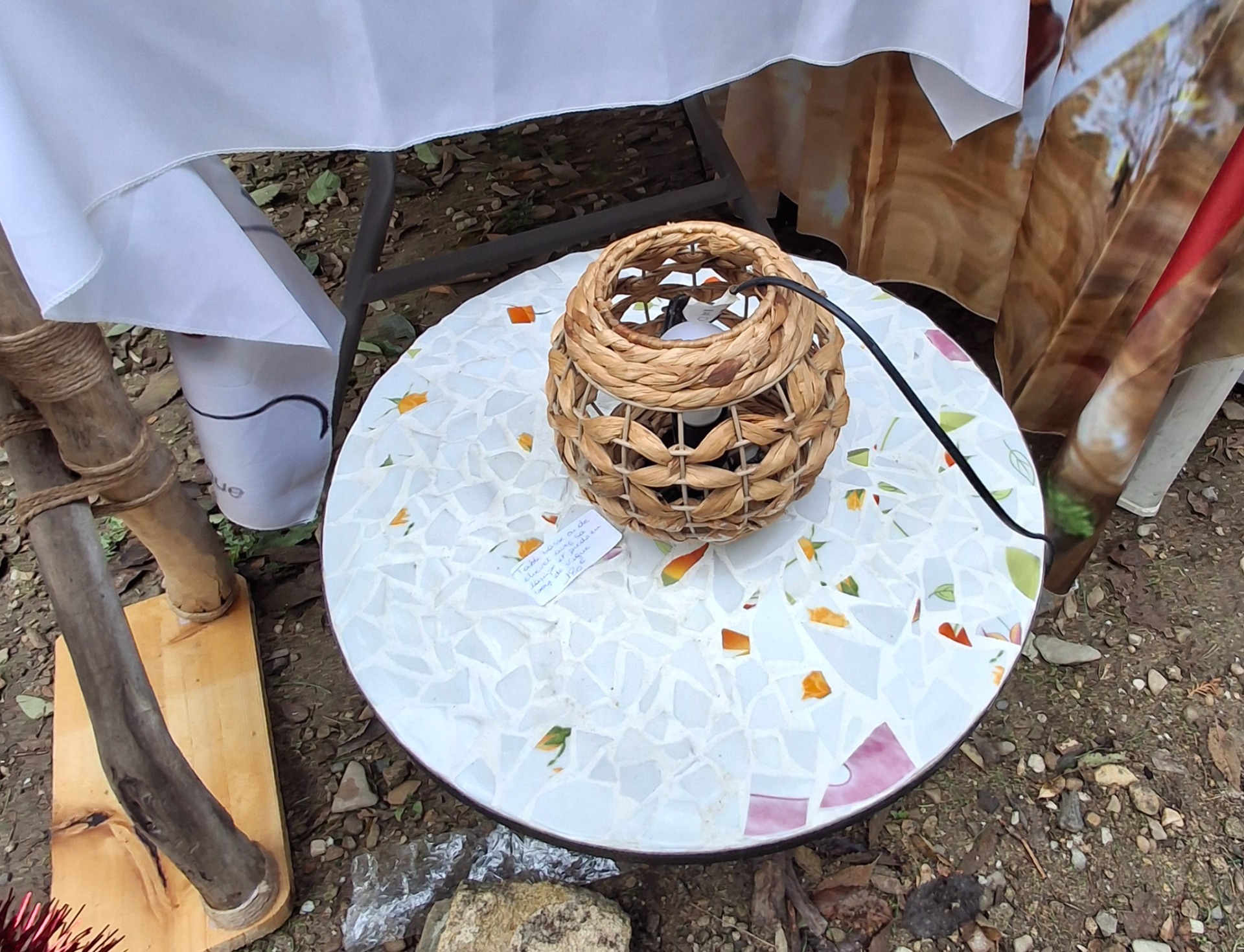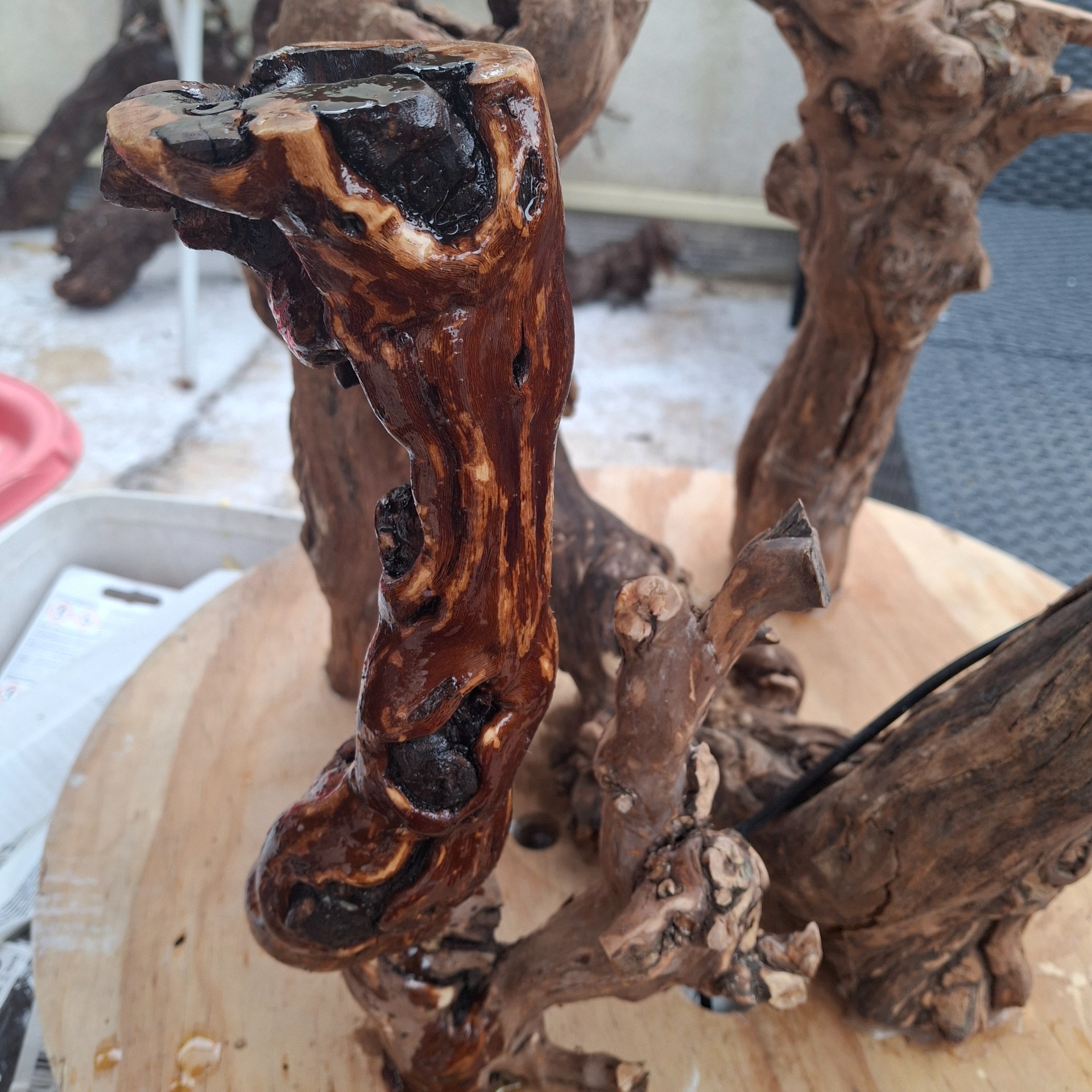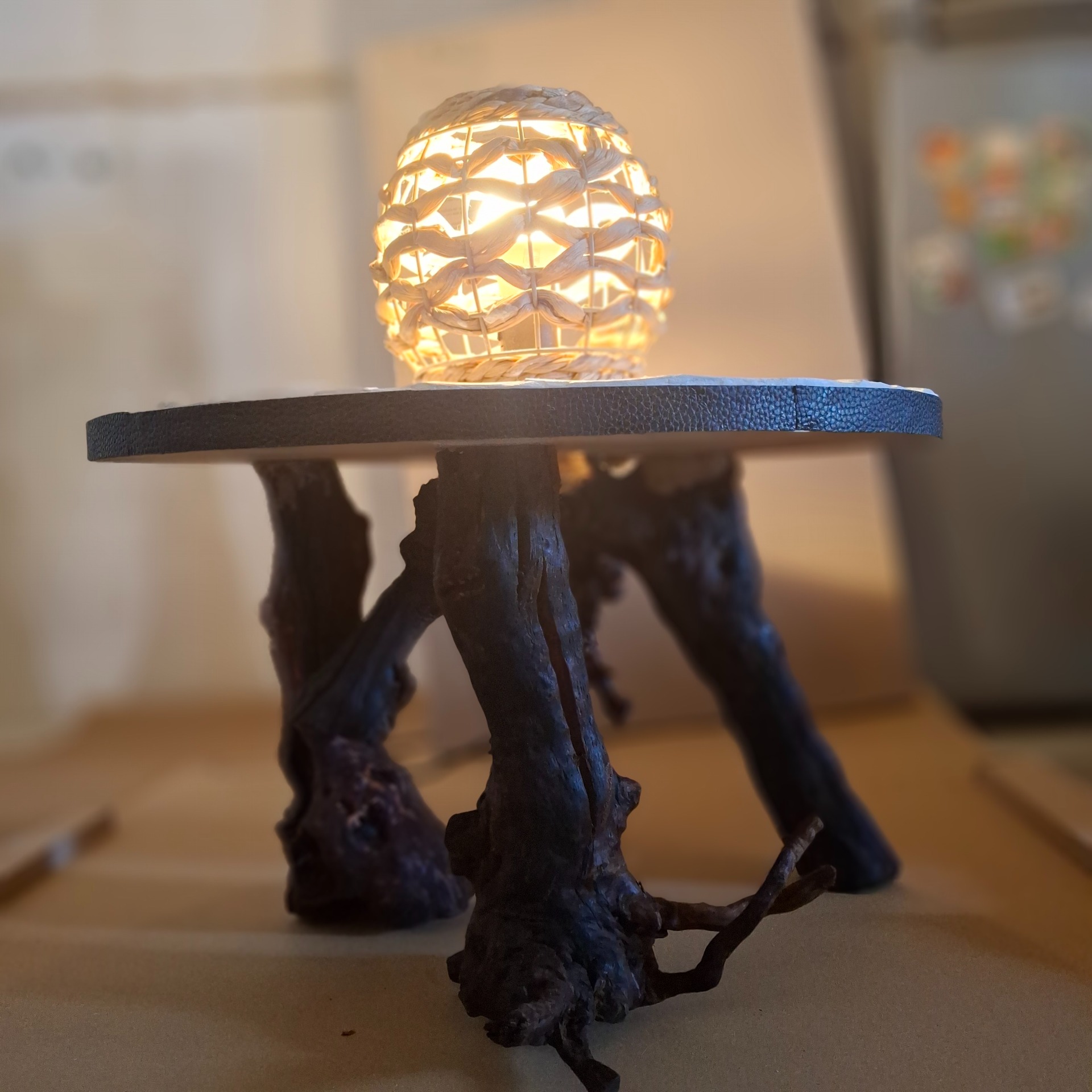 Les pieds sont en souche de vigne, travaillés et traités avec de l'huile de lin. Le plateau est garni de mosaïque collée et jointée, ainsi qu'un imperméabilisant.